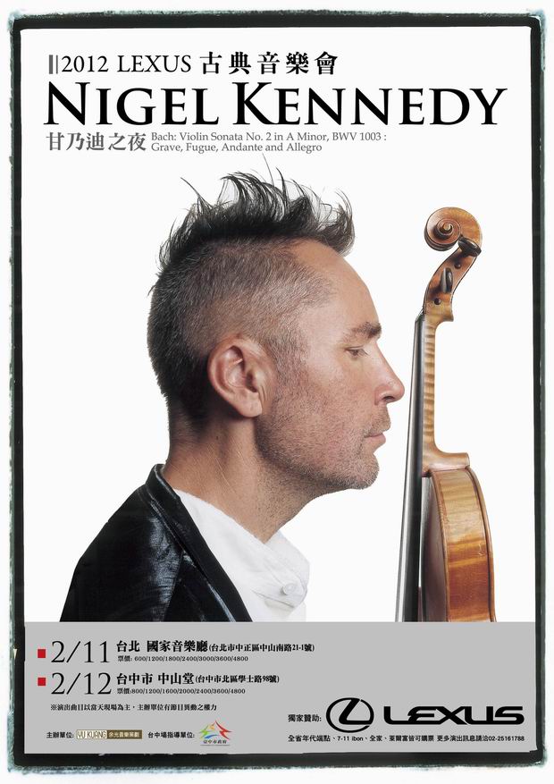 LEXUS古典音樂會自1998年舉辦至今,深受迴響與好評,年年為車主帶來完美的音樂饗宴。這次邀請到國際小提琴家甘乃迪演出,相信絕對是明年開春第一大音樂盛事。『2012 LEXUS 古典音樂會 NIGEL KENNEDY甘乃迪之夜』明年二月在台北、台中兩場演出: 2/11(六)台北國家音樂廳、2/12(日)台中中山堂,票價600~4800元,預計於11/21(一)於年代售票正式開賣! 購票請洽年代售票或余光音樂02-25161788。